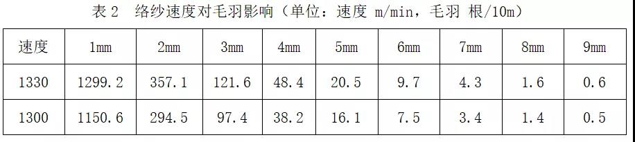 品種:陽離子滌綸T/R 65/35 18.4tex,試驗(yàn)條件:YG172A紗線毛羽測試儀,測試速度:30m/min,測試長度:60m,絡(luò)筒速度:1300m/min2.2.6.1 做好優(yōu)化工藝控制自絡(luò)毛羽增長的試驗(yàn)(1)優(yōu)選絡(luò)筒速度和絡(luò)紗張力,自動絡(luò)筒機(jī)絡(luò)紗張力、絡(luò)紗速度對毛羽有很大的影響。絡(luò)紗速度和絡(luò)紗張力在工藝調(diào)整時應(yīng)看做一個整體進(jìn)行,如果僅考慮一個工藝參數(shù)會適得其反,具體優(yōu)選時相互結(jié)合,可以做到高速運(yùn)行毛羽增長幅度不大的效果。絡(luò)紗速度對毛羽影響見表2。