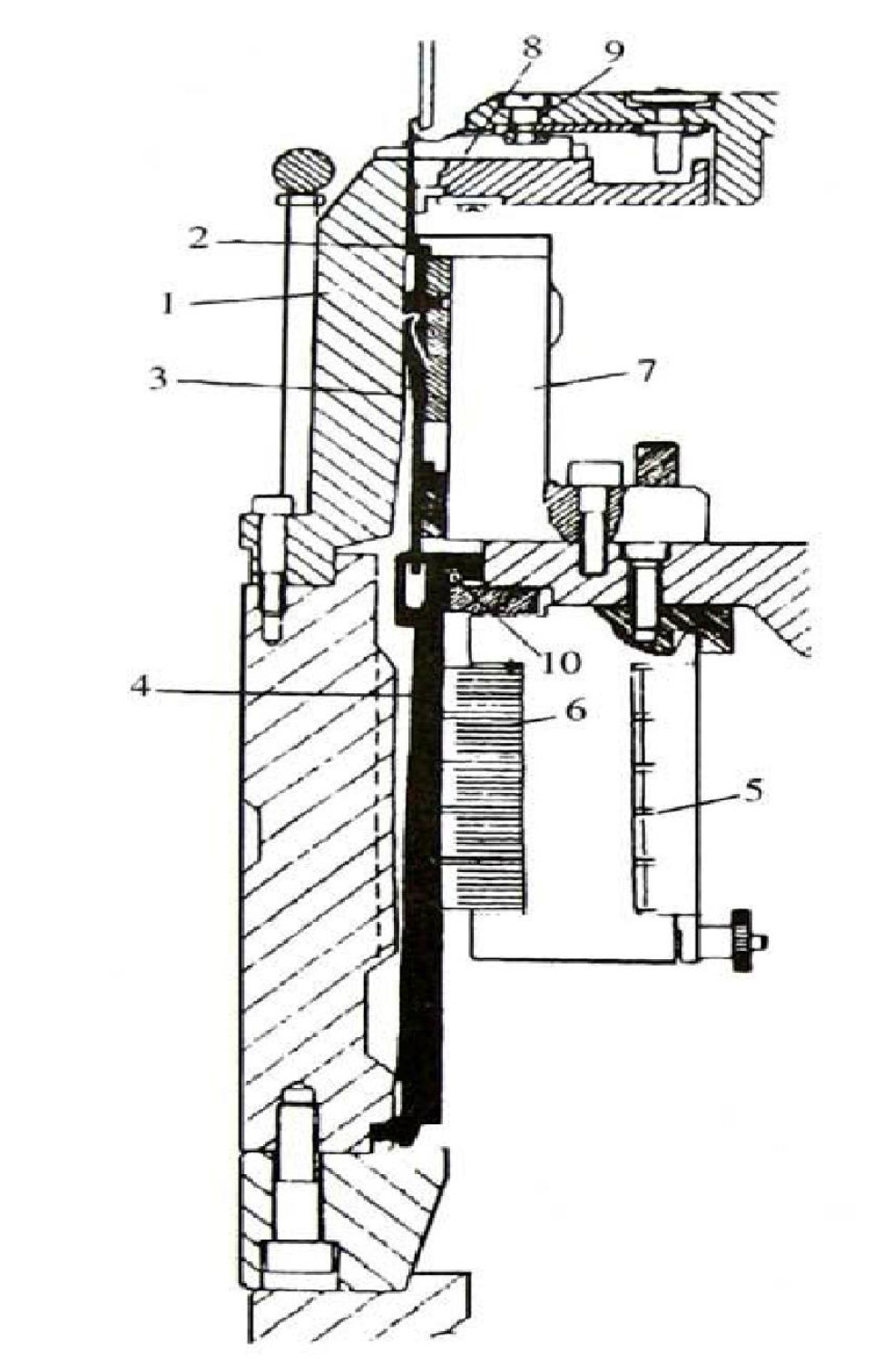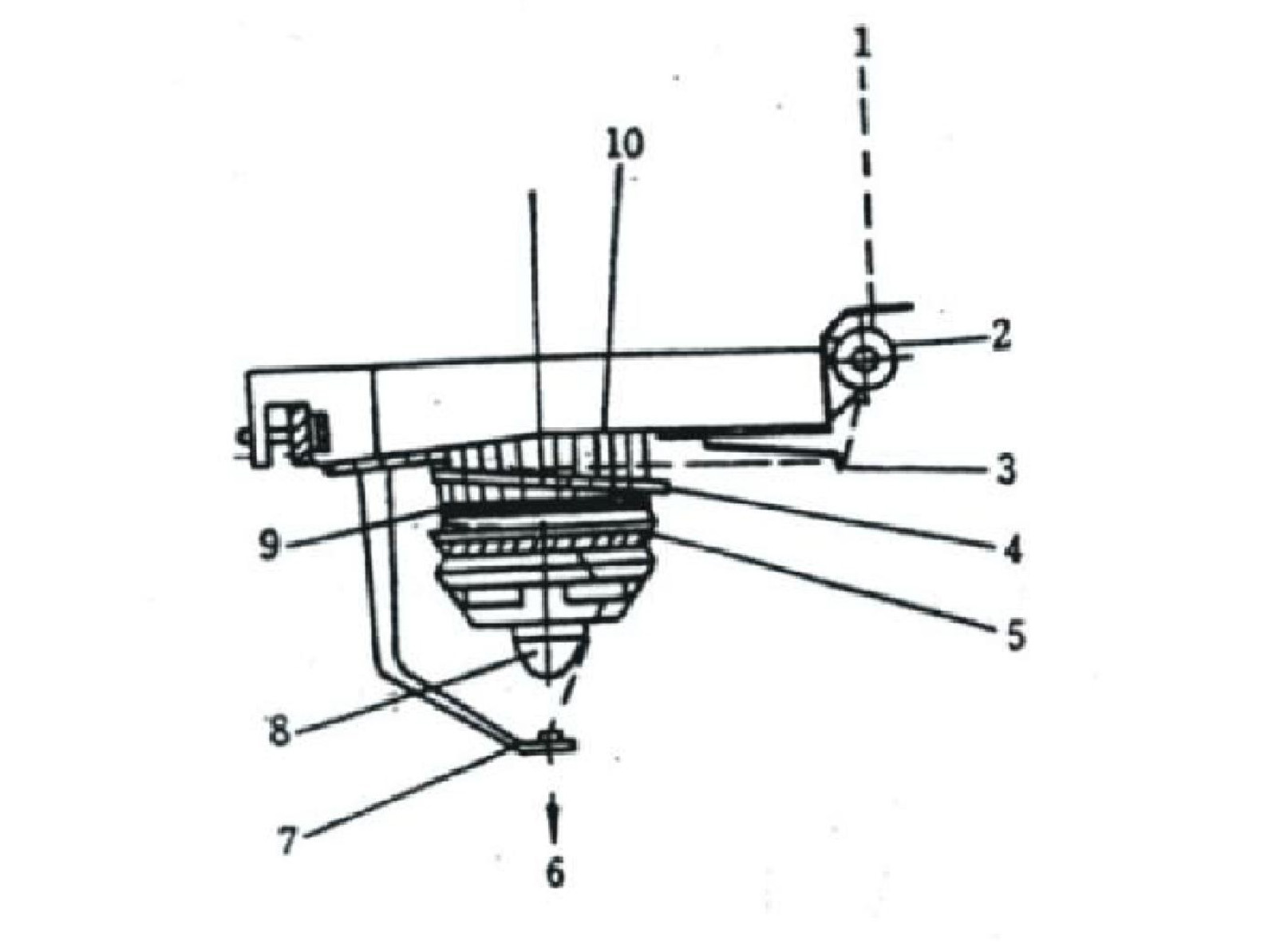 落地紗架上的紗筒經(jīng)一系列導(dǎo)紗鉤(改變方向)——半儲存式給紗裝置——編織區(qū)域。其中,半儲存式給紗裝置為消極式結(jié)紗裝置(如圖4-1),紗線1經(jīng)張力裝置2、斷紗自停探桿3(斷紗時指示燈8閃亮),切向卷繞在儲紗筒10上。儲紗筒由內(nèi)裝的微型電動機(jī)(老式)或條帶(新式)驅(qū)動。當(dāng)傾斜配置的圓環(huán)4處于最高位置時,它使控制電動機(jī)的微型開關(guān)接通,或使控制條帶與儲紗筒接觸的電磁離合器通電,從而電動機(jī)(或條帶)驅(qū)動儲紗筒回轉(zhuǎn)進(jìn)行卷繞。由于圓環(huán)4的傾斜,卷繞過程中紗線被推向圓環(huán)的最低位置。當(dāng)儲紗筒上的卷繞紗圖數(shù)達(dá)最大時(約4-5圈),圓環(huán)4使電動機(jī)開關(guān)斷開或電磁離合器斷電,因此,儲紗筒停止卷繞。