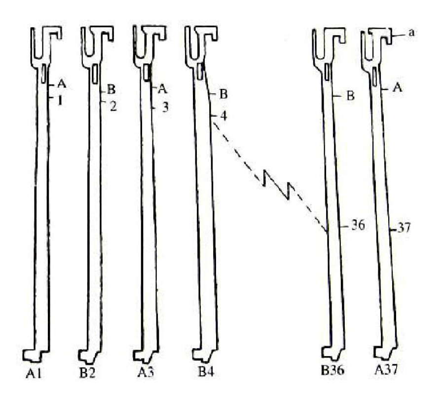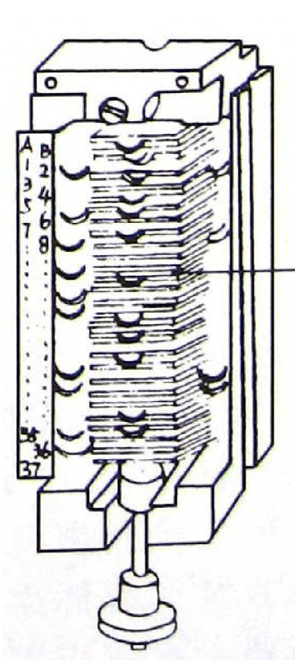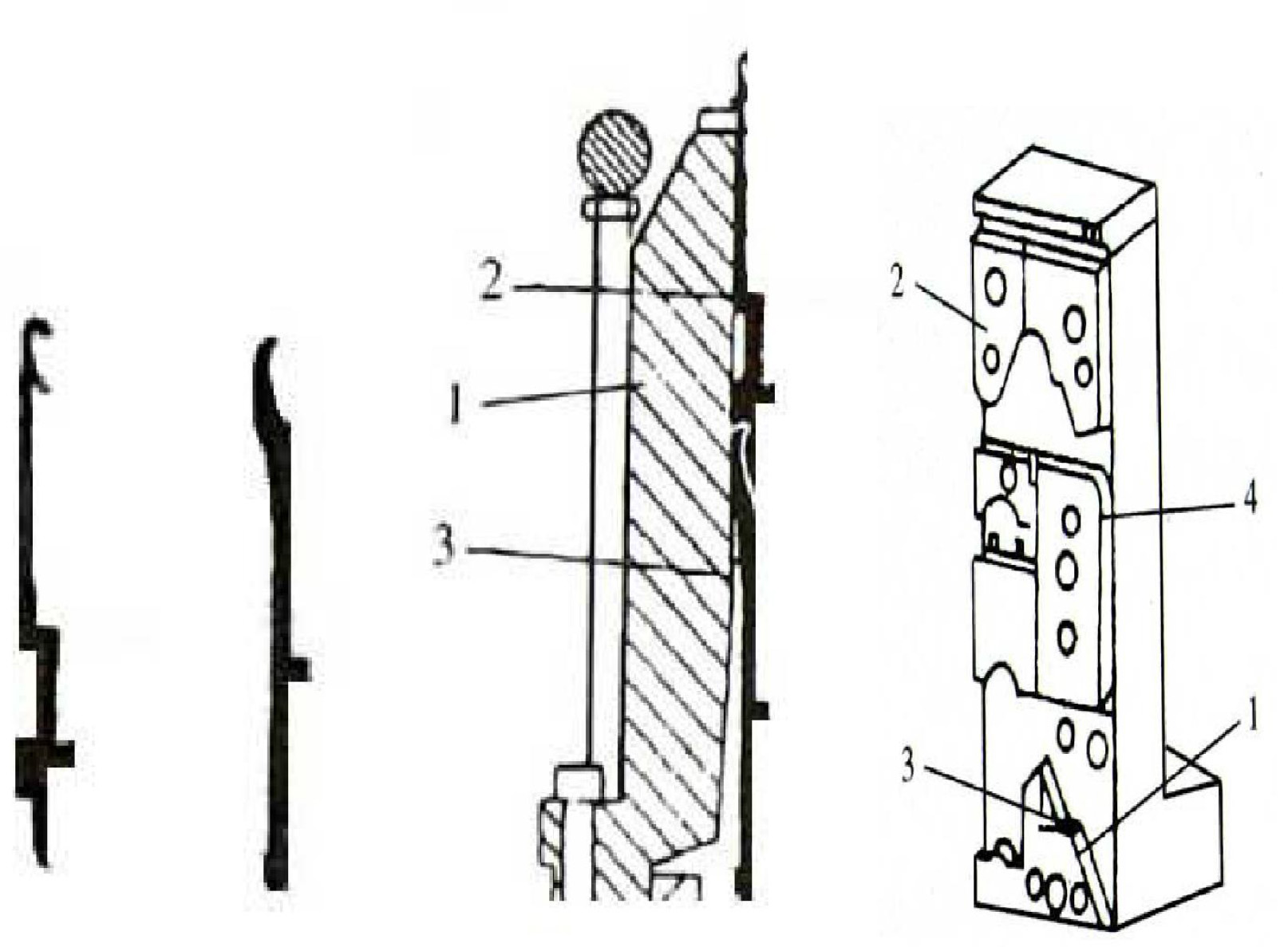 撥片式選針機(jī)構(gòu)由發(fā)出選針花紋信息的選針元件投片、傳遞花紋信息的機(jī)件提花片以及執(zhí)行花紋信息的工作機(jī)件織針組成。一般來說,它屬二級選針機(jī)構(gòu),即編織與不編織。其工作原理是,花紋信息—撥片—提花片——織針編織或不編織。