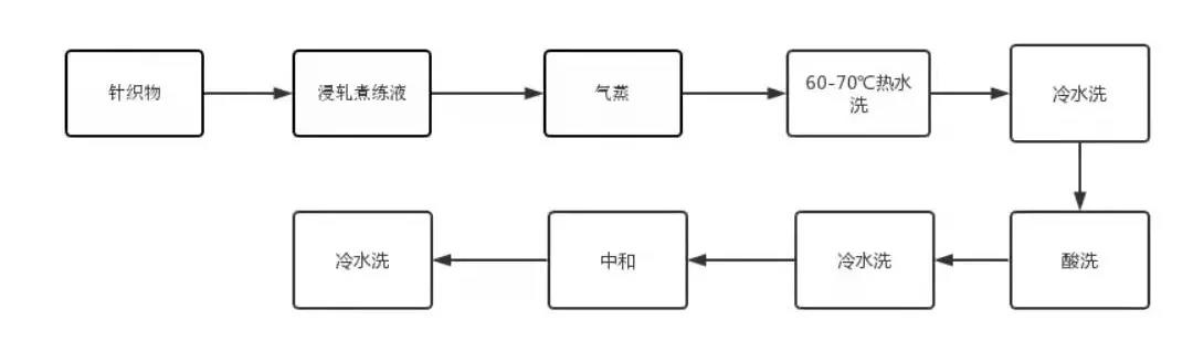 ②煮練的工藝針織物連續(xù)汽蒸煮練的工藝流程如下:經(jīng)堿縮后的針織物→浸軋煮練液→汽蒸→60-70℃熱水洗→冷水洗→酸洗→冷水洗→中和→冷水洗