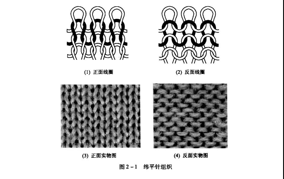 緯平針組織是由連續(xù)的同一種單元線圈向一個方向依次串套而成。緯平針組織的兩面具有不同的幾何形態(tài),正面線圈上的圈柱與線圈縱行配置成一定角度,紗線上的結(jié)頭、棉結(jié)雜質(zhì)容易被舊線圈所阻擋而停留在針織物的反面,因而正面一般較為光潔平整。反面的圈弧與線圈橫列同向配置,對光線有較大的漫反射作用,因而較為陰暗。