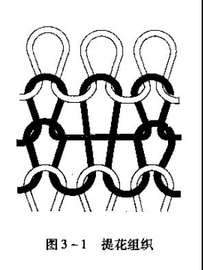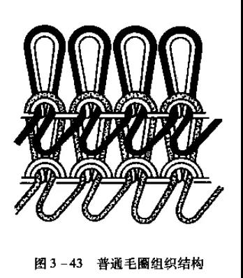 毛圈組織是由平針線圈和帶有拉長沉降弧的毛圈線圈組合而成。一般由兩根紗線編織。一根紗線編織地組織,另一根紗線編織帶有毛圈的線圈。毛圈組織可分為普通毛圈組織和花色毛圈組織兩類,同時還有單面和雙面之分。在普通毛圈組織中,每一只毛圈線圈的沉陣弧都形成毛圈而在花色毛圈組織中,毛圈是按照圖案花紋,僅在一部分線圈中形成。單面毛圈組織僅在織物工藝反面形成毛圈,而雙面毛圈組織則在織物的正反面都形成毛圈。