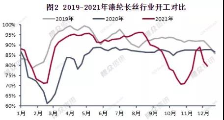 11月月底國內(nèi)部分生產(chǎn)企業(yè)減產(chǎn)保價(jià),滌綸長絲行業(yè)開工降至8成以下,期間江蘇、福建兩地前期減停裝置陸續(xù)重啟,行業(yè)開工小幅提升,近日部分廠商裝置減產(chǎn),滌綸長絲行業(yè)開工率再度下降,整體開機(jī)率在8成以下,而目前冬季訂單已告罄,春季訂單稀少,一方面海外疫情并未有效控制,海運(yùn)費(fèi)居高不下,另一方面國內(nèi)多地疫情反復(fù),導(dǎo)致行業(yè)人士信心不足,滌綸長絲目前行業(yè)開工已處于同期相對較低的水平,然織造整體開工在6成以下,供需矛盾下滌綸長絲開工仍有下降的預(yù)期。綜上,多重利空拖累下,滌綸長絲供需將出現(xiàn)雙降的局面。