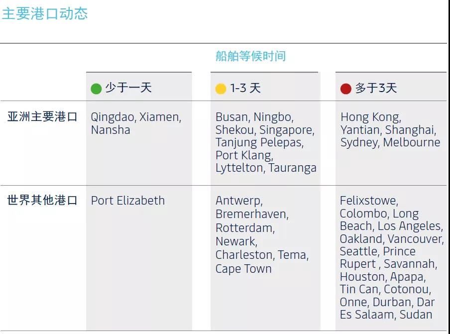 根據馬士基最新的亞太區(qū)供應鏈市場趨勢報告(2021年11月),全球主要港口動態(tài)如下表: