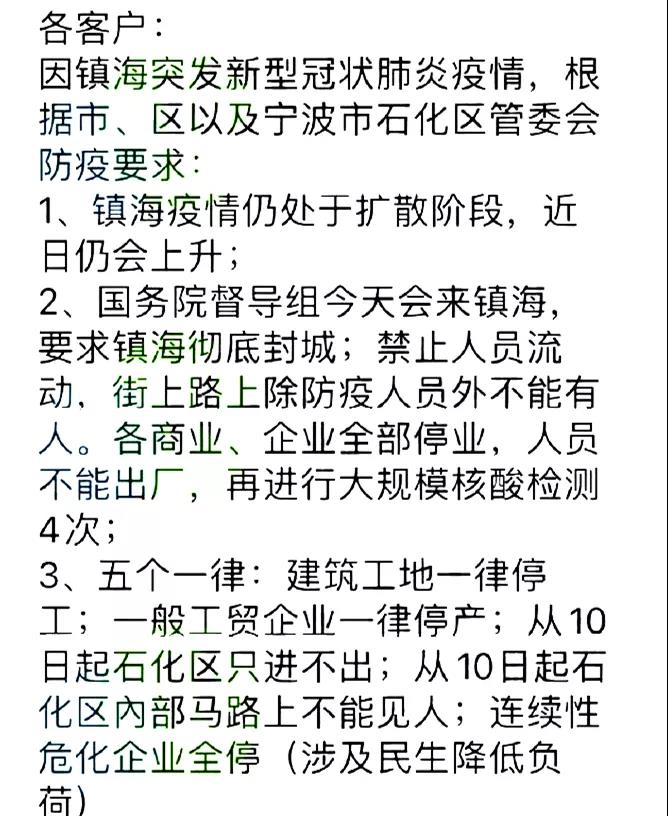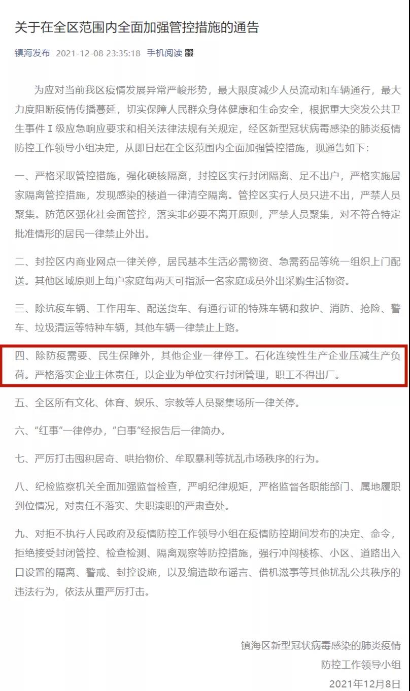 紹興上虞啟動(dòng)I級應(yīng)急響應(yīng),多個(gè)區(qū)域臨時(shí)實(shí)施封閉管理。除防疫需要和民生保障以外,區(qū)域內(nèi)其他各類企業(yè)暫時(shí)停工。另據(jù)部分企業(yè)表示,全區(qū)所有工業(yè)企業(yè)一律實(shí)施停產(chǎn)防疫,非化企業(yè)12月9日14時(shí)起立即嚴(yán)格執(zhí)行停產(chǎn)防疫措施,化工企業(yè)12月9日14時(shí)起嚴(yán)格執(zhí)行停止投料,啟動(dòng)執(zhí)行安全停產(chǎn)方案,有檢維修等作業(yè)的一并執(zhí)行停止作業(yè)。