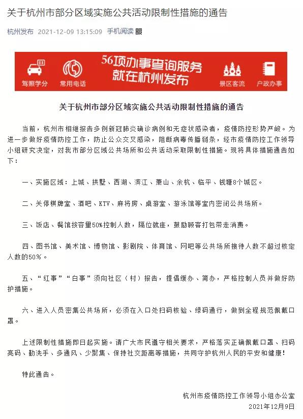經(jīng)市疫情防控工作領(lǐng)導(dǎo)小組研究決定,對杭州市部分區(qū)域公共場所和公共活動(dòng)采取限制性措施。上城、拱墅、西湖、濱江、蕭山、余杭、臨平、錢塘8個(gè)城區(qū),關(guān)停棋牌室、酒吧、KTV、麻將房、桌游室、游泳館等室內(nèi)密閉公共場所等。