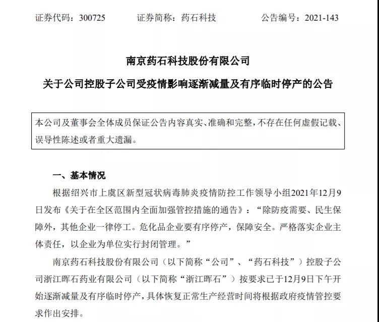藥石科技:公司控股子公司浙江暉石藥業(yè)有限公司按要求已于12月9日下午開始逐漸減量及有序臨時(shí)停產(chǎn),具體恢復(fù)正常生產(chǎn)經(jīng)營時(shí)間將根據(jù)政府疫情管控要求作出安排。預(yù)計(jì)本次逐漸減量及有序臨時(shí)停產(chǎn)將延遲浙江暉石產(chǎn)品的生產(chǎn)和交付,將對浙江暉石經(jīng)營業(yè)績產(chǎn)生一定的不利影響。