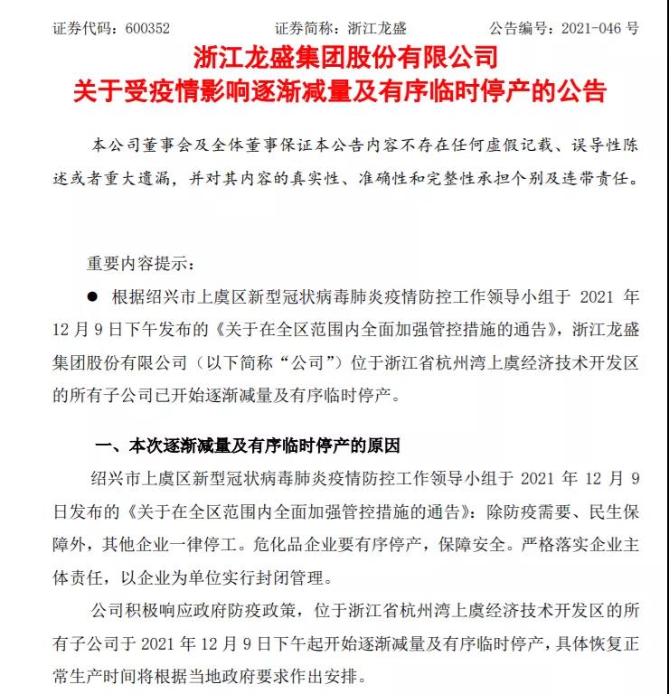 浙江龍盛:受疫情影響,公司位于浙江省杭州灣上虞經(jīng)濟(jì)技術(shù)開發(fā)區(qū)的所有子公司已開始逐漸減量及有序臨時(shí)停產(chǎn)。上述子公司主要目前主要生產(chǎn)染料、化工中間體、減水劑等化工產(chǎn)品,預(yù)計(jì)此次臨時(shí)停產(chǎn)將延遲公司相關(guān)產(chǎn)品的生產(chǎn)和交付,會(huì)對公司本月經(jīng)營業(yè)績產(chǎn)生不利影響。