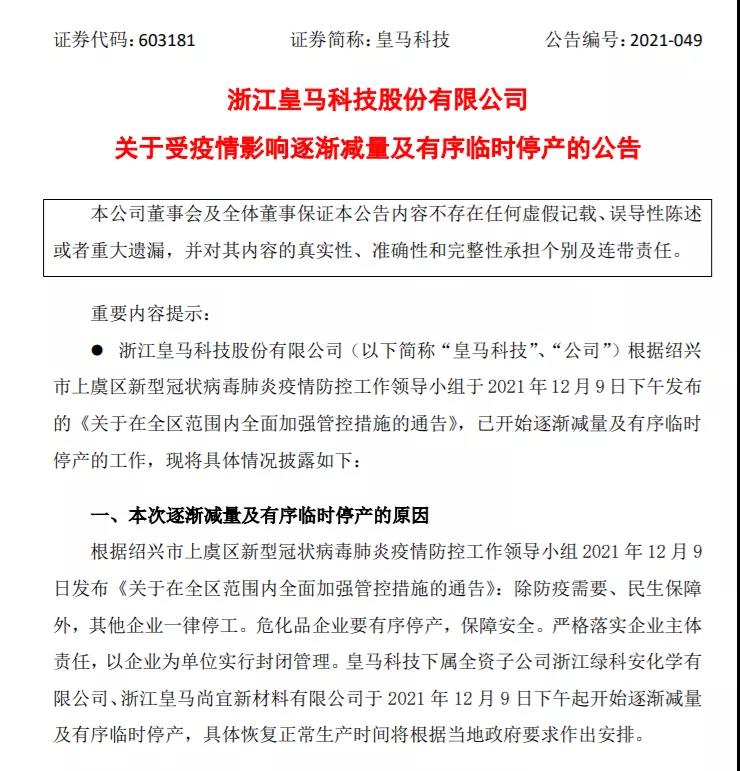 皇馬科技:公司下屬全資子公司浙江綠科安化學(xué)有限公司、浙江皇馬尚宜新材料有限公司于12月9日下午起開始逐漸減量及有序臨時(shí)停產(chǎn)。預(yù)計(jì)本次逐漸減量及有序臨時(shí)停產(chǎn)將延遲公司產(chǎn)品的生產(chǎn)和交付,預(yù)計(jì)會(huì)對公司本月經(jīng)營業(yè)績產(chǎn)生不利影響。