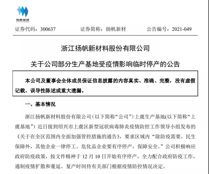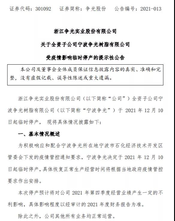 爭光股份:全資子公司寧波爭光樹脂有限公司于2021年12月10日起臨時(shí)停產(chǎn),具體恢復(fù)正常生產(chǎn)經(jīng)營時(shí)間將根據(jù)當(dāng)?shù)卣咔楣芸匾笞鞒霭才拧?/span>
