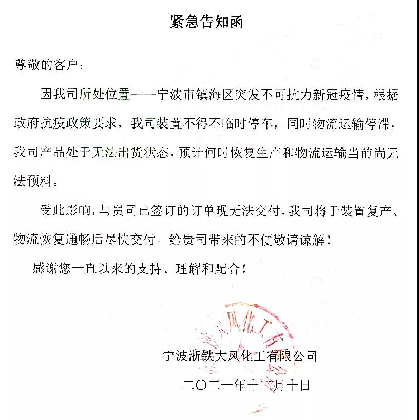 寧波浙鐵大風(fēng)化工:根據(jù)要求,裝置不得不臨時(shí)停車,物流運(yùn)輸停滯,產(chǎn)品處于無法出貨狀態(tài),已簽訂的訂單現(xiàn)無法交付。