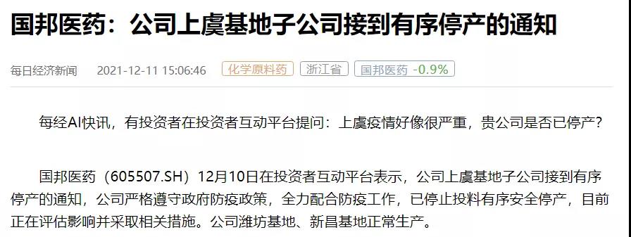 國邦醫(yī)藥:公司上虞基地子公司接到有序停產(chǎn)的通知,已停止投料有序安全停產(chǎn),目前正在評估影響并采取相關(guān)措施。