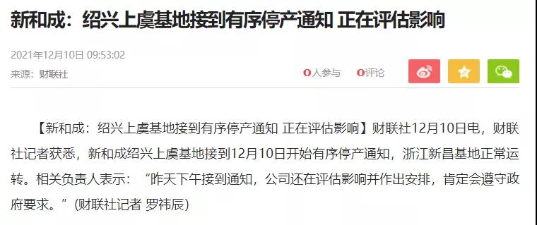 新和成:紹興上虞基地接到12月10日開始有序停產(chǎn)通知,公司還在評估影響并作出安排。