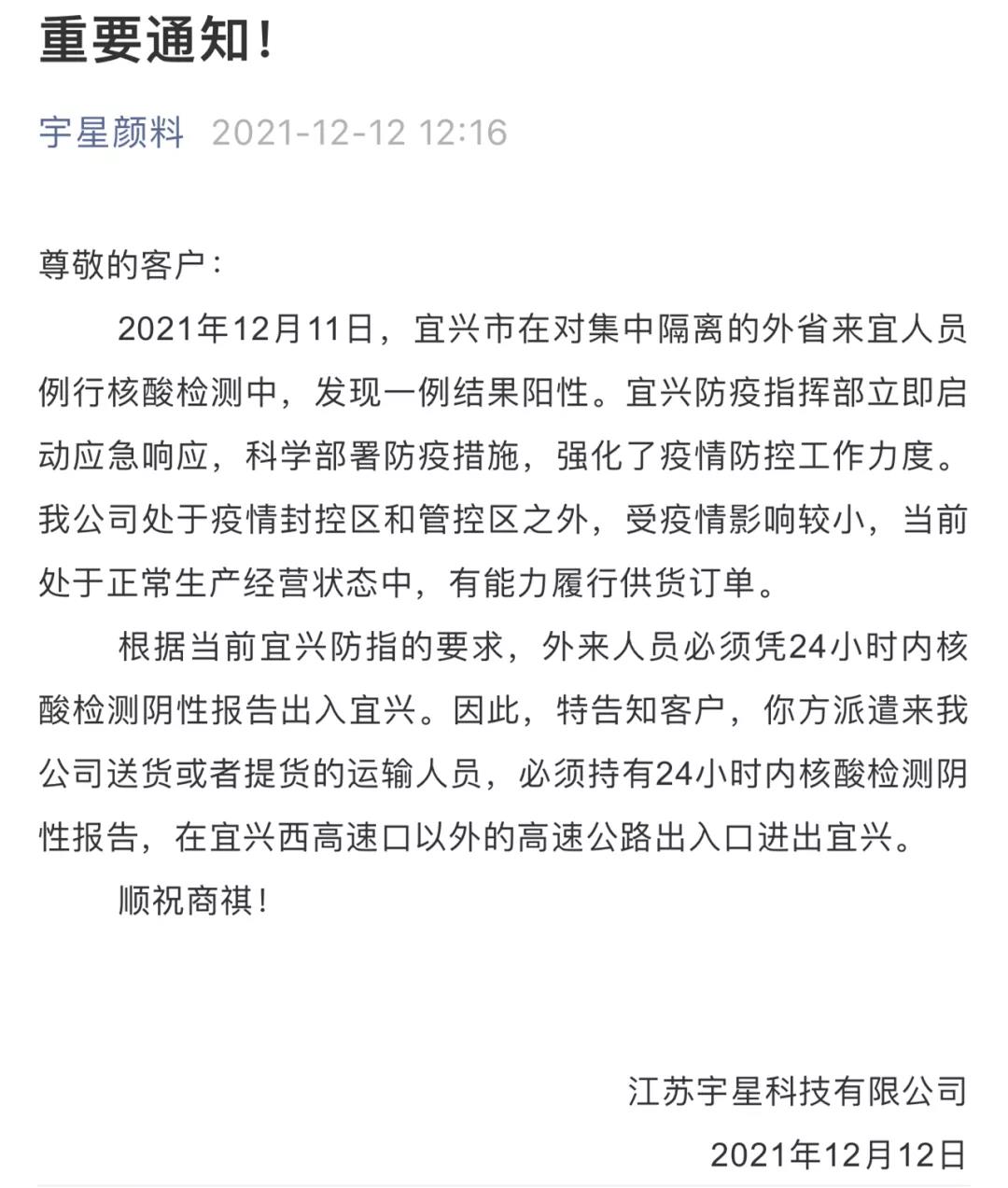 除此之外,江蘇宇星顏料、江蘇三木集團(tuán)、華祥(中國)高纖有限公司、榮盛集團(tuán)等當(dāng)?shù)仄髽I(yè)均提示客戶,由于當(dāng)?shù)匾咔榉忾],來提貨或送貨的運(yùn)輸人員,須持有24/48小時(shí)內(nèi)核酸檢測陰性報(bào)告,并注意選擇特定高速口進(jìn)出,健康碼為紅碼、黃碼的司機(jī)及外來人員一律不準(zhǔn)進(jìn)入。