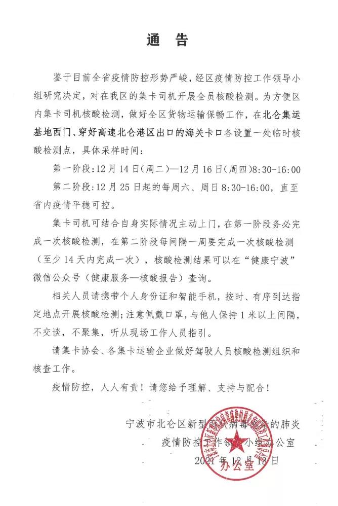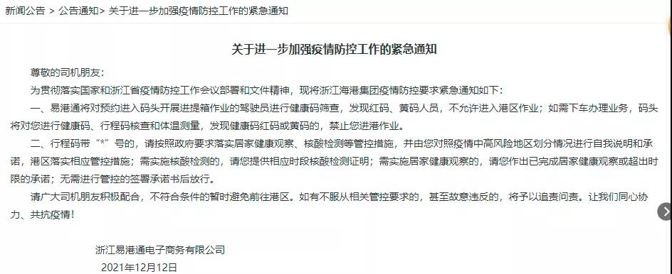 12月12日,受疫情升級(jí)影響,寧波舟山港發(fā)布了關(guān)于進(jìn)一步加強(qiáng)疫情防控工作的緊急通知,將對(duì)預(yù)約進(jìn)入碼頭開(kāi)展進(jìn)提箱作業(yè)的駕駛員進(jìn)行健康碼篩查。