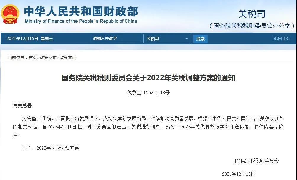 12月15日,國務(wù)院關(guān)稅稅則委員會(huì)發(fā)布2022年關(guān)稅調(diào)整方案,對(duì)部分商品的進(jìn)出口關(guān)稅進(jìn)行調(diào)整。相關(guān)方案,除另有規(guī)定外,自2022年1月1日起實(shí)施。