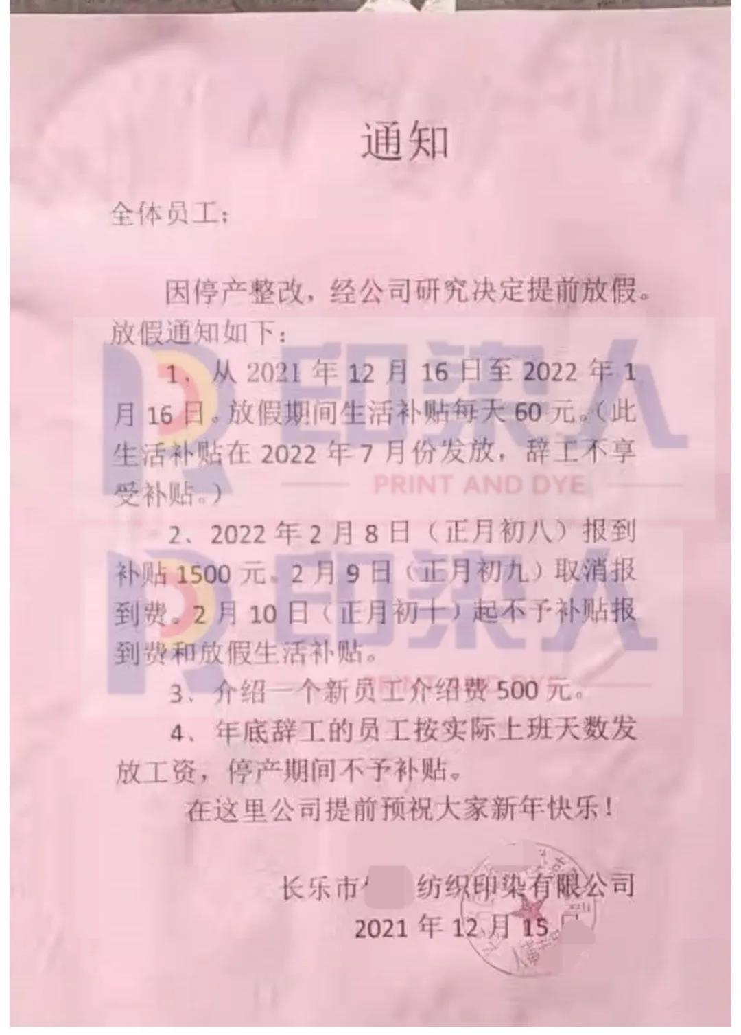 印染人從渠道獲悉,福建長(zhǎng)樂某印染廠因停產(chǎn)原因,自12月16日開始放假,2022年2月8日員工報(bào)道,并對(duì)放假期間補(bǔ)助進(jìn)行詳細(xì)說明。