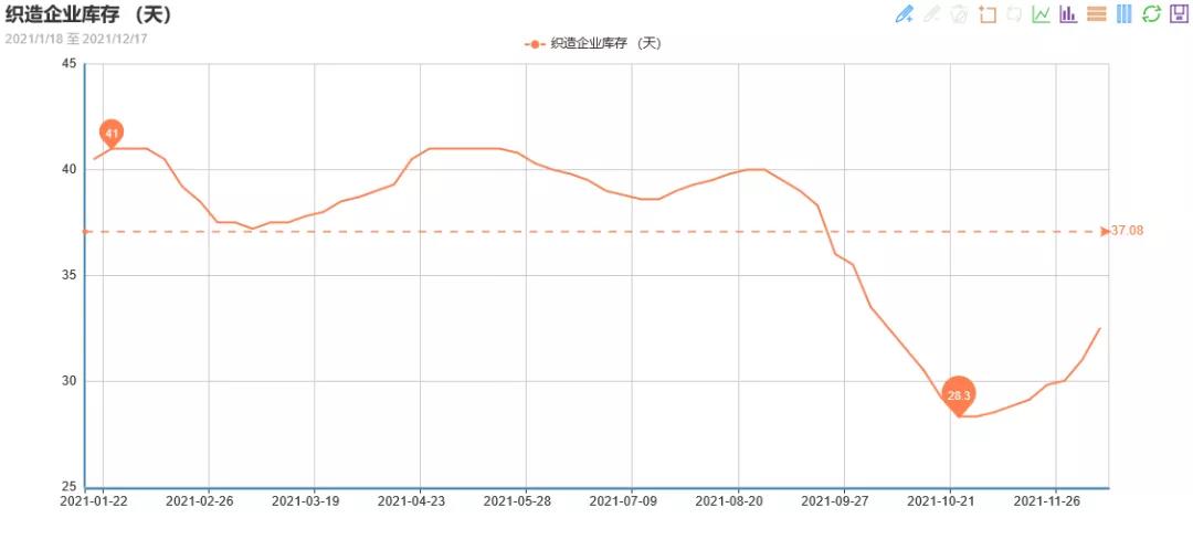 另一方面,近期由于浙江疫情及年底需求較差,市場(chǎng)傳言今年紡織廠的放假時(shí)間可能會(huì)出現(xiàn)提前的情況。目前織造廠家的庫(kù)存正處于上升階段,據(jù)綢都網(wǎng)數(shù)據(jù)監(jiān)測(cè)顯示,目前織造廠家的庫(kù)存在32.5天左右,較11月上升4天。另外江浙多地紡織廠及貿(mào)易商反饋,近一周多來常規(guī)坯布詢價(jià)和出貨仍沒有多大起色,成交價(jià)明顯回落,部分廠家調(diào)整幅度超過20%。同時(shí)原料價(jià)格也以小幅陰跌為主。