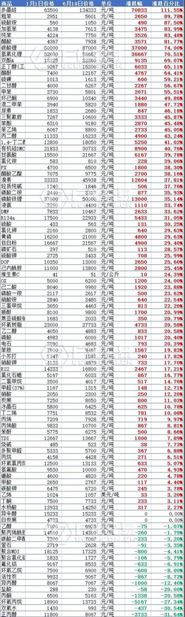 可以看到,盡管二季度化工產(chǎn)品價格有所回落,但整體來看,化工品今年仍有較大的漲幅。