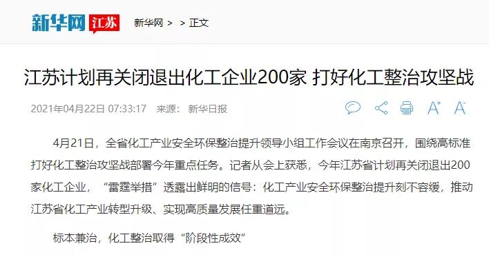 江蘇今年提出,計劃再關(guān)停退出200家化企。數(shù)據(jù)顯示,2016年以來,全省累計關(guān)閉化工企業(yè)4454家,總數(shù)從近7000家下降至2341家,壓減率約65%;化工園區(qū)從54家壓減至29家,壓減率為46%。