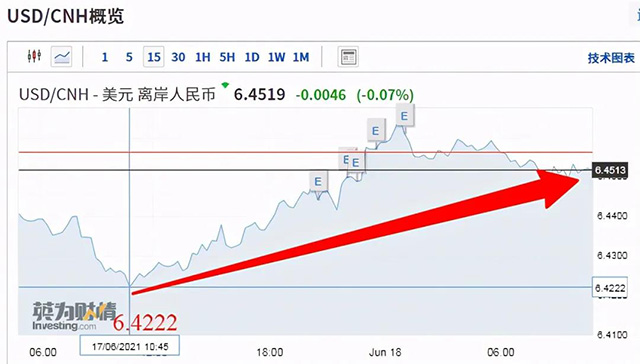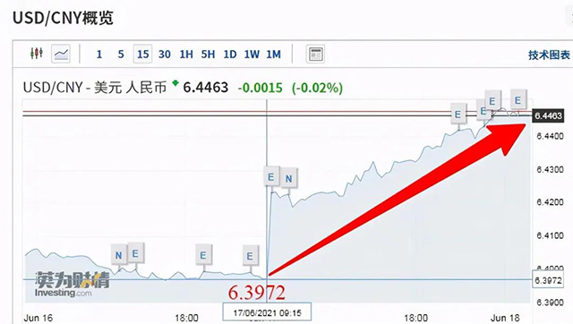 6月以來,在岸人民幣匯率累計下跌633個基點,跌幅達(dá)0.99%;離岸人民幣匯率累計下跌近600點,跌幅達(dá)到0.93%。6月18日,人民幣對美元匯率中間價報6.4361,較前一交易日下調(diào)63個基點。