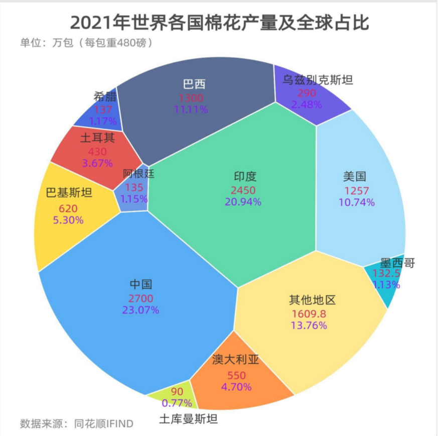 2021/2022年度,中國以2700萬包(每包重480磅)位居全球第一棉花生產(chǎn)國,占全球總產(chǎn)量的23.07%,印度以2450萬包的產(chǎn)量僅次于中國,而巴基斯坦棉花年產(chǎn)量為620萬包,占全球總產(chǎn)量的5.3%,位列第五名。巴基斯坦規(guī)劃部長表示,巴基斯坦將面臨糧食短缺,因為歷史上最嚴(yán)重的洪災(zāi)造成農(nóng)作物損失。巴基斯坦45%的棉花作物被洪水沖走,水果、蔬菜和大米作物也遭受巨大損失。受此影響,如果產(chǎn)量下降,該國紡織行業(yè)將被迫進口更多棉花,從而進一步推高國際棉花市場價格。由于今年美國、巴西、其他國家的棉花作物產(chǎn)量下降,全球市場已面臨供應(yīng)減少。下圖為2021年全球棉花產(chǎn)量分布及全球占比,具體如下: