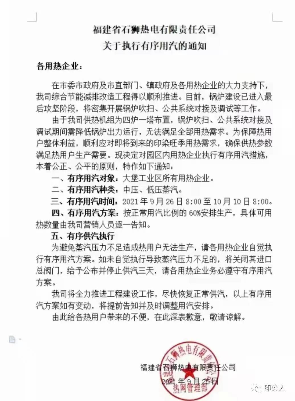 9月25日,福建省石獅市熱電有限責(zé)任公司發(fā)布《關(guān)于執(zhí)行有序用汽的通知》。將對石獅大堡工業(yè)區(qū)所有用熱企業(yè)實(shí)行有序供汽,時(shí)間期限從2021年9月26