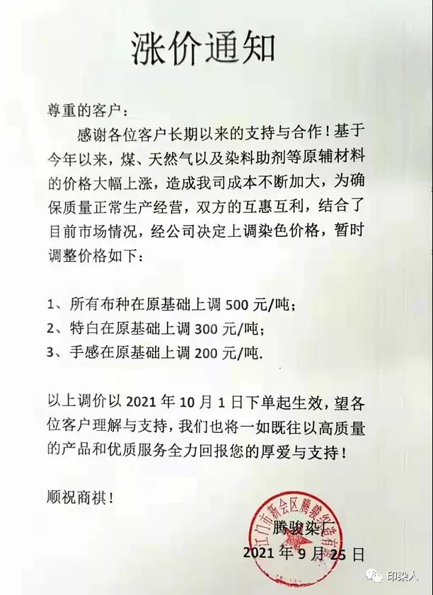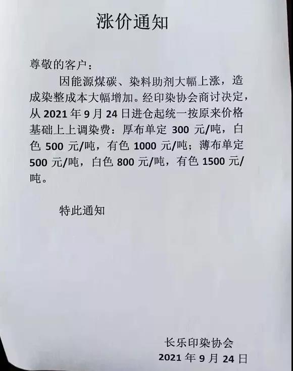 紡織印染生產(chǎn)地,也有印染企業(yè)實(shí)在受不了生產(chǎn)成本的高漲發(fā)出染費(fèi)調(diào)整的通知。來看市場最新消息。