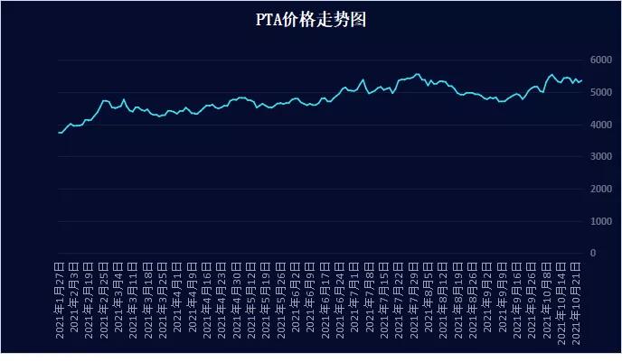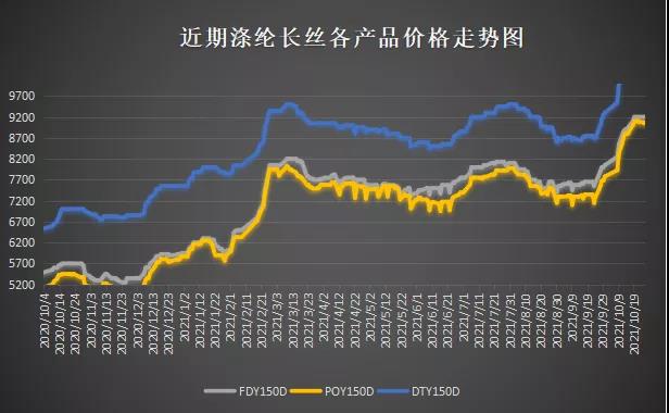 受動力煤影響,上游化纖原料PTA、乙二醇、滌綸長絲等聚酯產(chǎn)品價格開始出現(xiàn)回調(diào)現(xiàn)象。PTA在上周沖高后連續(xù)下跌,期貨價格較10月15日下降80元/噸。2021年四季度以來,滌綸長絲價格震蕩上揚,遠(yuǎn)超2019-2020年同期價格,在10月中旬達到近期最高值。但隨后開始出現(xiàn)下跌,目前震蕩運行,似乎漲勢結(jié)束。從下圖的曲線圖中我們也可以看到下跌趨勢,原料價格踩下上漲剎車,或恢復(fù)低價。