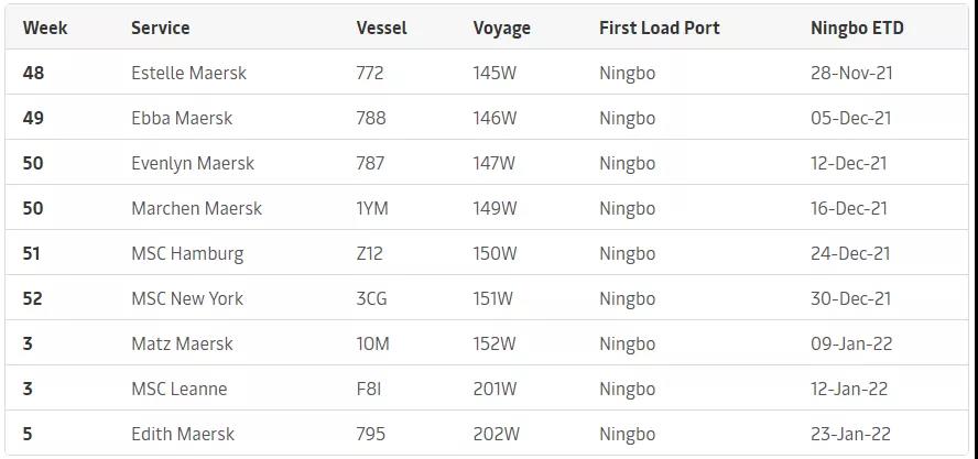 從中國寧波港出發(fā)的AE7/Condor將省略Felixstowe的船名航次如下: