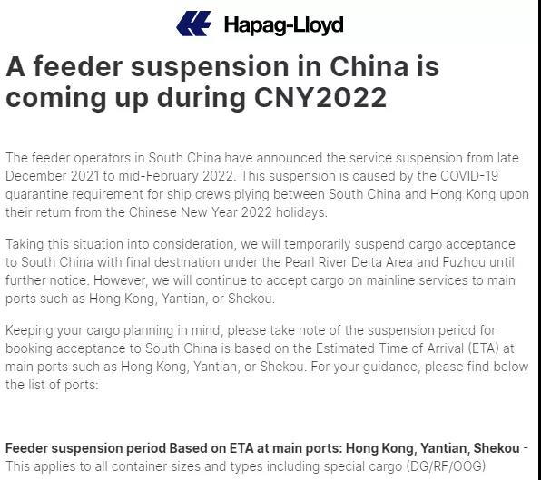 繼23日ONE發(fā)布公告暫停接收經(jīng)華南地區(qū)主要港口再通過國內支線到達最終目的地的貨物后,26日晚,赫伯羅特官網(wǎng)也發(fā)布公告,由于在2022年春節(jié)假期結束后,往返華南和香港的船員需要接受新冠肺炎檢疫。華南支線運營商已宣布從2021年12月底至2022年2月中旬暫停服務。