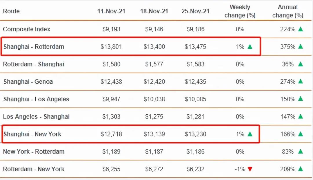 三是疫情期歐美、東盟等各國物流受阻,我國各港口集裝箱非常緊張,甚至“一箱難求”,近期海運(yùn)費(fèi)價(jià)格連續(xù)大幅上漲,德魯里指數(shù)顯示,上海-鹿特丹的運(yùn)費(fèi)上漲1%即75美元達(dá)到13475美元/FEU。同樣,上海至紐約的即期運(yùn)費(fèi)上漲1%至13230美元/FEU。然而,上海-熱那亞、上海-洛杉磯的運(yùn)價(jià)徘徊在前幾周的水平附近。德魯里預(yù)計(jì)未來一周利率將保持穩(wěn)定。