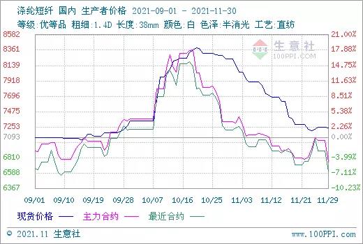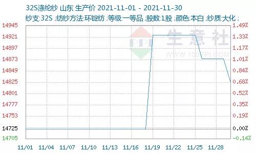 另據(jù)生意社價(jià)格監(jiān)測顯示,純滌紗市場報(bào)價(jià)穩(wěn)跌互現(xiàn),截止11月30日,山東地區(qū)32S滌綸紗現(xiàn)貨市場均價(jià)在14825元/噸左右,較上周下跌50元/噸,較月初價(jià)格(14725元/噸)上漲100元/噸。據(jù)一些市場人士反映,成交量相比前期沒有改觀,而貿(mào)易商家心態(tài)多已無力,純滌紗廠家?guī)齑胬^續(xù)增加,出貨心理較濃。