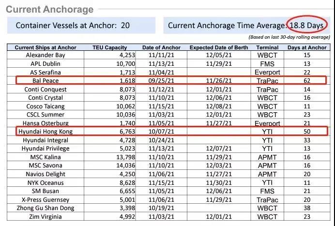 據(jù)洛杉磯港signal平臺11月26日的最新數(shù)據(jù)顯示,目前在洛杉磯港和長灘港外每艘船的平均等待靠泊的時(shí)間已達(dá)到18.8天,是兩個(gè)月前的兩倍多,這艘"Bal Peace"的集裝箱船等待靠泊已達(dá)62天,雖然新的船舶排隊(duì)系統(tǒng)算法表面上看等待的船只減少了,但是船舶實(shí)際等待的時(shí)間加長了,這無疑令這兩大港口外集裝箱船的擁堵情況愈發(fā)惡化。