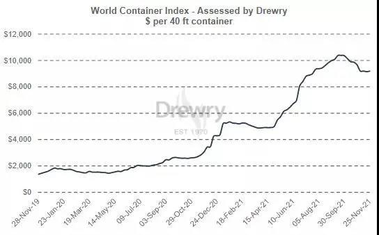 而德魯里上周最新綜合世界集裝箱指數(shù)保持穩(wěn)定,維持在每40英尺集裝箱9186.39美元,但仍比去年同期高出224%。由其評估的年初至今的WCI平均綜合指數(shù)為每40英尺集裝箱7413美元,比每40英尺集裝箱2690美元的五年平均值高出4723美元。