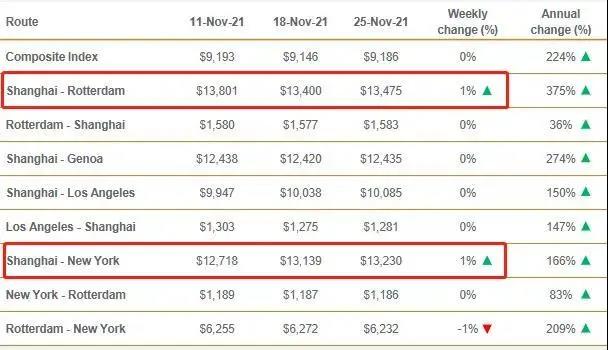 德魯里指數(shù)顯示,上海-鹿特丹的運(yùn)費(fèi)上漲1%即75美元,達(dá)到13475美元/FEU。同樣,上海-紐約的即期運(yùn)費(fèi)上漲1%至13230美元/FEU。上海-熱那亞、上海-洛杉磯的運(yùn)價(jià)徘徊在前幾周的水平附近,預(yù)計(jì)未來一周利率將保持穩(wěn)定。