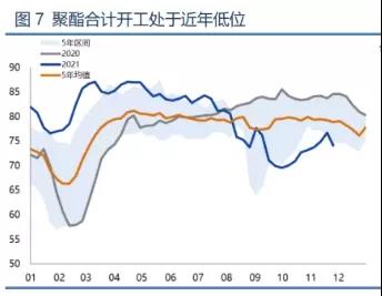 從分項(xiàng)來看,截至2021年12月2日,國內(nèi)滌綸長絲開工負(fù)荷77.11%,環(huán)比-6.19%;滌綸短纖開工負(fù)荷67.02%,環(huán)比-1.31%;聚酯瓶片開工負(fù)荷維持78.46%不變。整體開工也處于近5年低位。